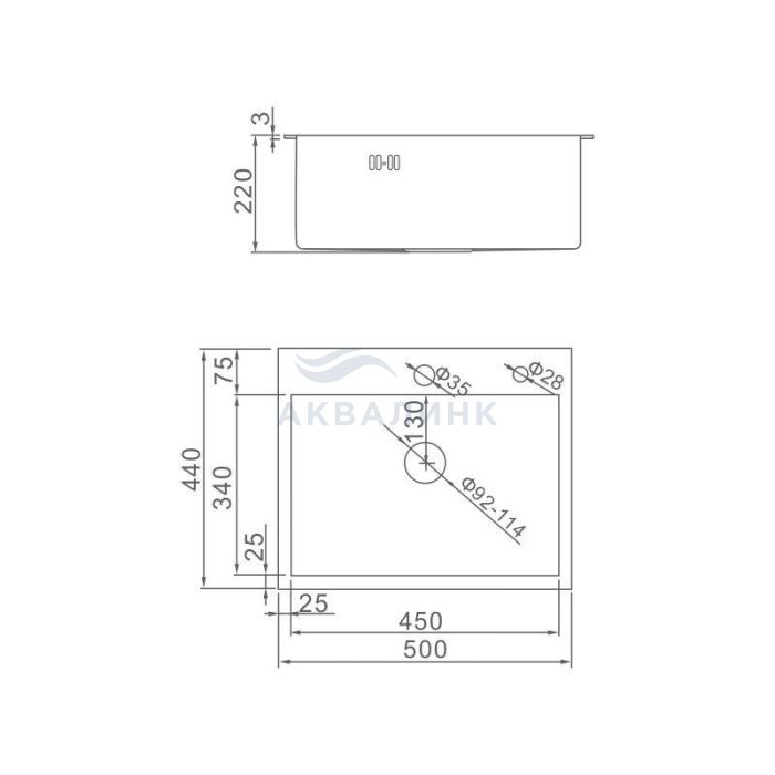 AF95044 Мойка врезная нерж. 50х44 AFLORN, толщина 3,0 мм, покрытие Сатин, с сифоном (упакованы по 5 штук)