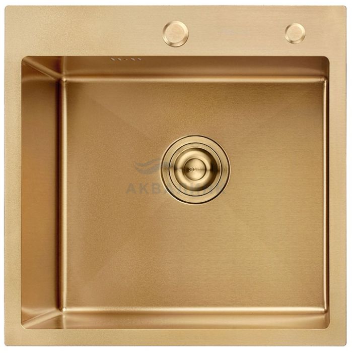кухонная мойка премиум 500*500 (1 мм) глубина 22см. нерж. сталь, золотой сатин (K35050G) Gerhans предназначена для размещения в отверстие кухонной столешницы и имеет размеры 500*500 мм, глубина мойки 220 мм. Изготовлена из нержавеющей стали марки SUS304 с PVD покрытием (напыление в вакууме), диаметр сливного отверстия 90 мм, конструкция с отверстием для перелива, с отверстиями для смесителя и крана питьевой воды. Сифон для мойки идет в комплекте.