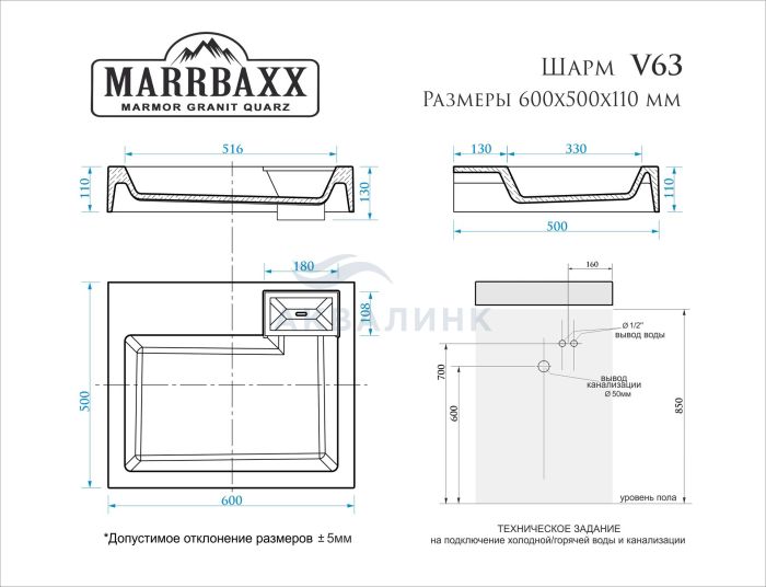 Шарм V63 Общий размер:600 x 500 x 110 Макс.глубина стиральной машины - 390мм Материал-литьевой мрамор;раковина устанавливается на кронштейны над стиральной машиной(не допустимо монтировать на столешницу стиральной машины). Комплектация: В комплект входят два кронштейна,четыре закладные в раковине болт-гайка, упаковка -пятислойный белый гофрокартон и пупырчатая пленка.
