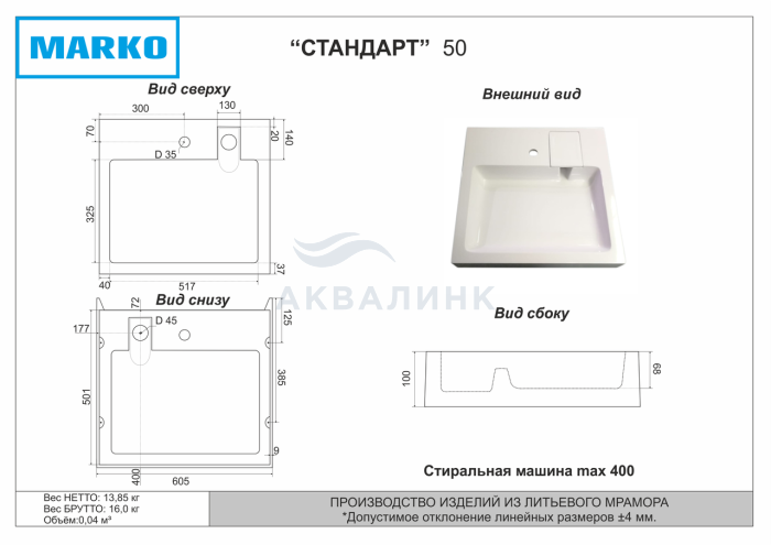 24378 5227500 - Раковина - 50 СТАНДАРТ 599х500х103 над стиральной машиной с кроншт б/сифона