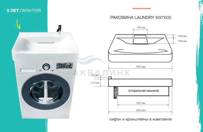 Раковина над стиральной машиной 60х60 Marka One Laundry с сифоном