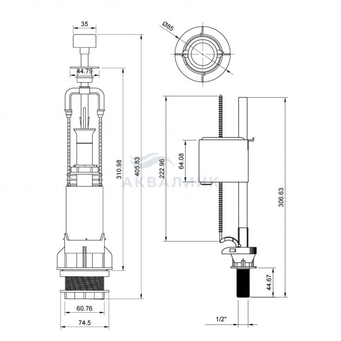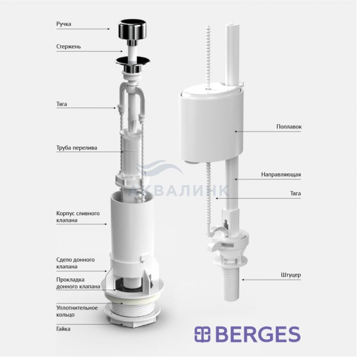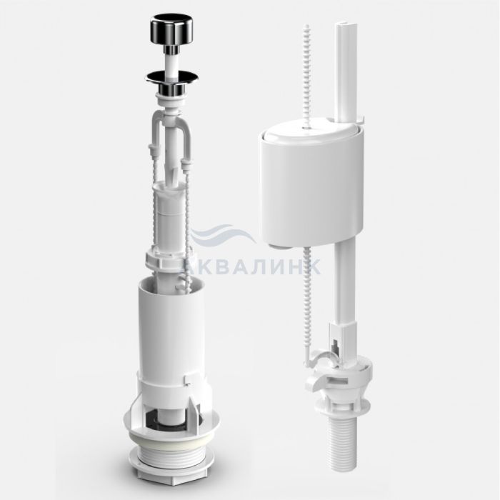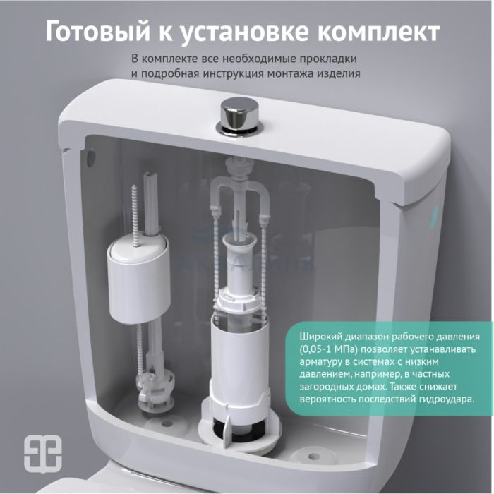 Комплект арматуры Eko 01 Артикул: 030101 Сливной клапан: механизм слива воды: шток кнопка металлизированная Наполнительный клапан: нижний подвод воды штуцер пластик 1/2 Комплект прокладок