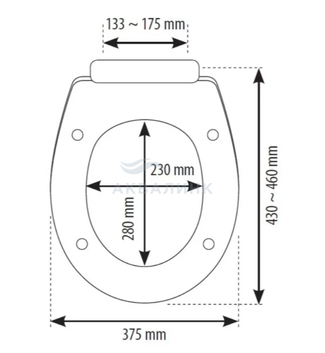 Ширина: 375 мм Длина: 430 — 460 мм Размеры внутреннего овала сиденья: 230х285 мм Регулируемое межосевое расстояние: 133 — 175 мм Материал: полипропилен с антистатичными свойствами Угол открывания: 98° Крепление: регулируемая полиамидная планка, крепежные болты из ацеталя
