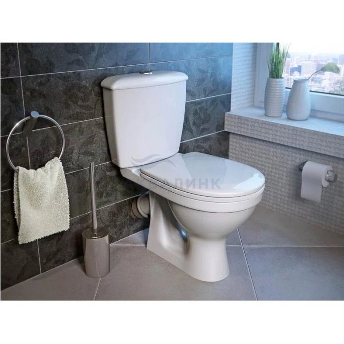 Унитаз-компакт "Суперкомпакт" косой Козырьковая чаша ("антивсплеск") - с уклоном задней стенки. Крышка-сиденье - белое (гарант. 3г). Арматура одноуровневая, фирмы "Уклад". Круговой перфорированный смыв.