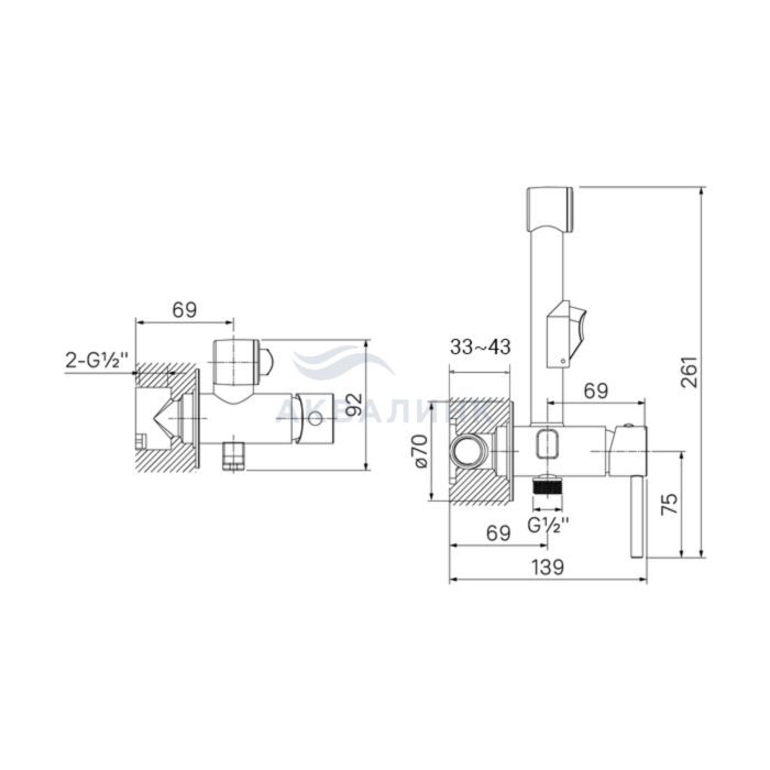 Встраиваемый смеситель с гигиеническим душем со стильным сатиновым покрытием подойдет для современной ванной, привнесет в нее комфорт и эстетику. Имеет крючок для полотенца; крючок и держатель для лейки при необходимости можно поменять местами. Гигиеническая лейка и гладкий душевой шланг длиной 1,2 метра в комплекте. • Экономит пространство и упрощает уборку — благодаря скрытому монтажу в стену (на глубину 40-60 мм) и отсутствию больших выступающих элементов конструкции. Подключается с помощью любых труб, диаметр входных отверстий ½ дюйма. • Надежный корпус из прочной первичной латуни марки ЛЦ40С ГОСТ 17711-93 с пониженным содержанием свинца — стойкий к коррозии, резким изменениям давления и перепадам температуры воды. • Плавный ход ручки и абсолютная точность регулировки температуры и напора воды — за счет качественного керамического картриджа Softap (прошел тестирование на жизненный ци