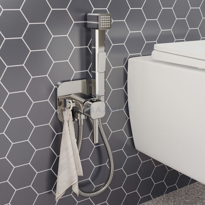Встраиваемый смеситель с гигиеническим душем и крючком для полотенца, квадратный, однозахватный, латунь, керамический картридж Softap. В комплекте: шланг 1.2м, гигиеническая лейка ABS-пластик. Упаковка: картонная коробка, индивид мешок. 004SBS0i08 Смеситель оборудован крючком для полотенца. Крючок можно установить как слева, так и справа.