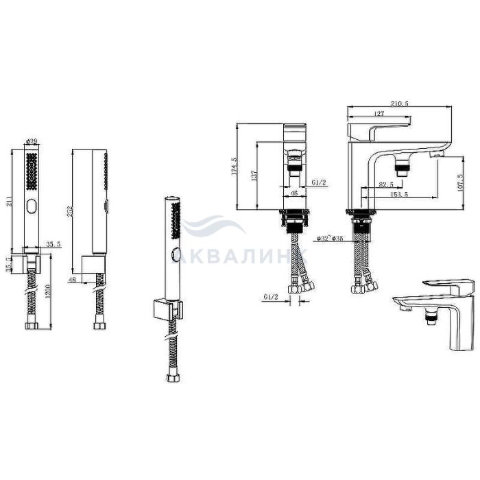 Смеситель для ванны и душа Aquatek Вега AQ1044BGM, с гигиеническим душем
