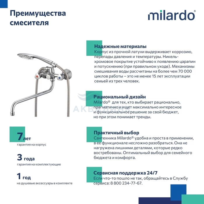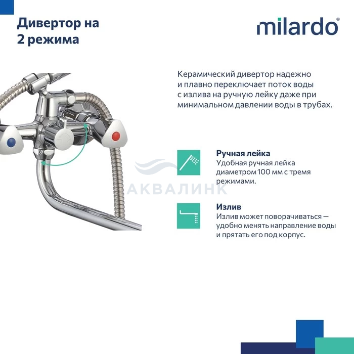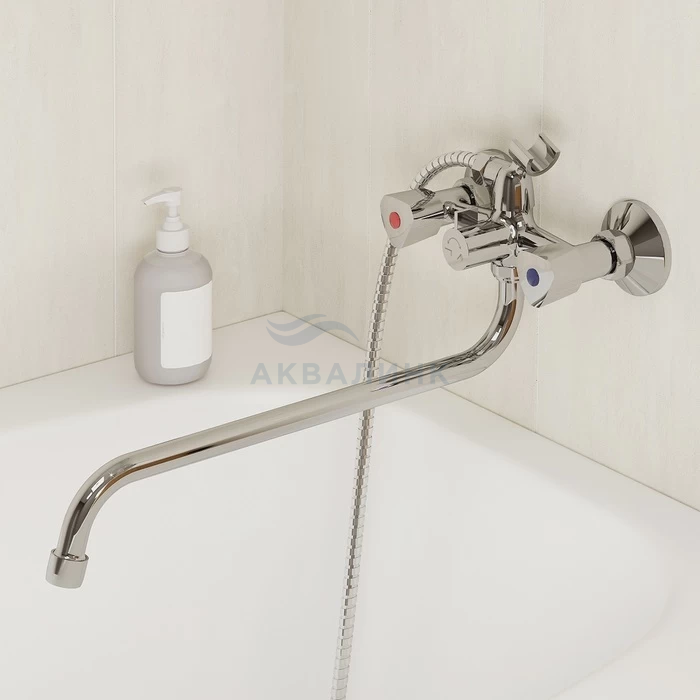 ВНИМАНИЕ: Лейка в комплекте может быть 3-режимной или 1-режимной (зависит от партии). Смеситель для ванны с длинным изливом, Tring, Milardo, TRISB02M10 Треугольные ручки дополняют лаконичный дизайн смесителя Tring. Благодаря такой форме и углу поворота в 180 градусов регулировать температуру и напор воды удобно даже мыльной рукой. Термоизоляция ручек не позволяет им нагреваться – взрослые и особенно дети защищены от случайных ожогов. Длинный (350 мм) изогнутый излив делает смеситель удобным как для купания, так и для уборки или стирки. Лейка для душа (3 режима) с держателем, ПВХ-шланг (1,5 м) в оплетке из нержавеющей стали и крепеж идут в комплекте.