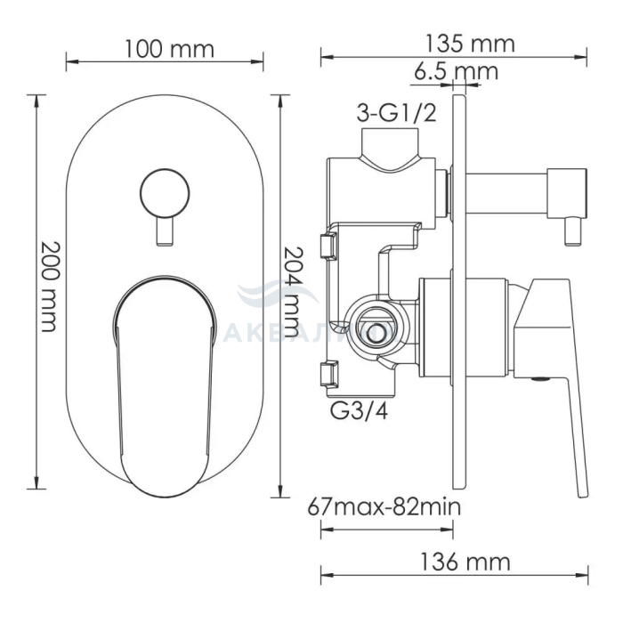 Смеситель для ванны и душа WasserKRAFT встраиваемый Donau 5341